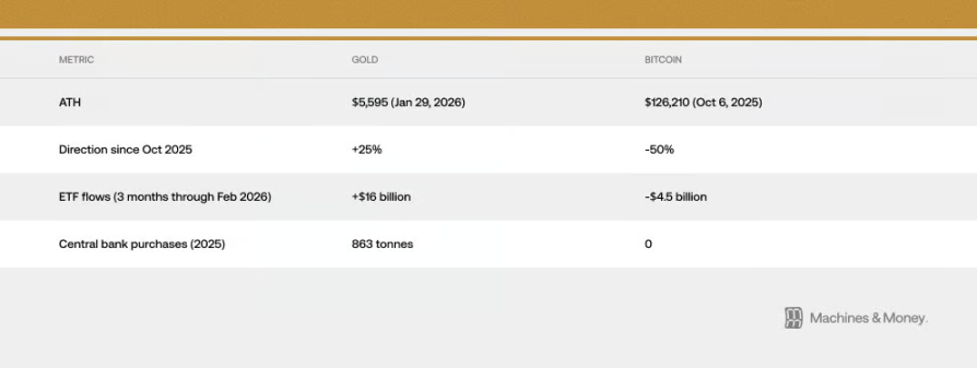 이는 완벽하게 비트코인이 '디지털 금' 속성을 보여줄 이상적인 환경이었다. 그러나 2025년 10월 이후 일어난 일은 다른 답을 제시한다: 금은 4,400달러에서 5,595달러의 사상 최고가로 상승한 반면, 비트코인은 12만 6천 달러에서 6만 달러 대로 떨어졌다. 동일한 '인플레이션 방지' 기능을 부여받은 이 두 자산이, 그 기능을 발휘하기에 가장 유리한 순간에 완전히 반대 방향으로 움직인 것이다. 결과는 다음과 같다: