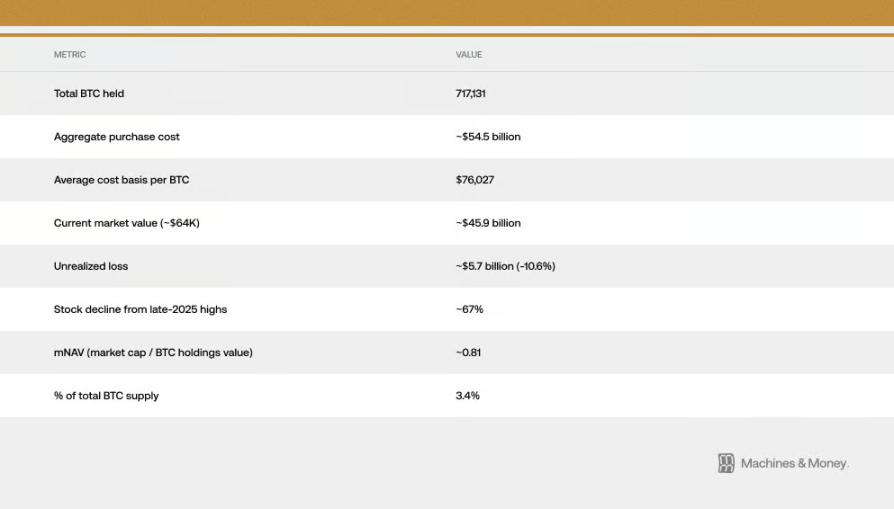 이 순환은 양방향이다. 소프트웨어 섹터가 부진하면 Strategy의 주가가 하락한다. Strategy 주가 하락은 시장의 비트코인에 대한 비관적 정서를 악화시키고, 심지어 일부 실제 매도 압력으로 이어질 수 있다. 시장이 하락할 때, 이 순환은 비트코인과 소프트웨어 지수의 관계를 더욱 긴밀하게 만든다. Strategy의 주가는 2025년 말 고점에서 약 67% 하락했으며, 소프트웨어 주식 ETF나 비트코인 자체의 하락폭보다 훨씬 크다. 현재 이 회사의 시가총액은 보유한 비트코인의 가치보다도 낮아, 할인된 거래를 하고 있는 셈이다. 이는 비트코인과 소프트웨어 주식의 상관관계 위에, 이 회사 자체가 가져오는 증폭 효과가 추가로 쌓여 있음을 시사한다.