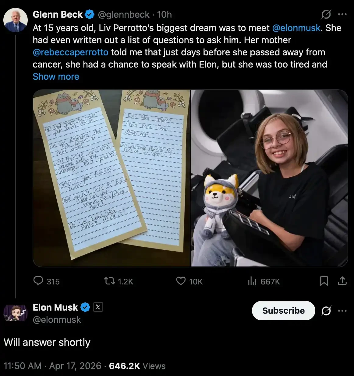 前几日,SpaceX 创始人 Elon Musk 在 X 上回复了媒体人 Glenn Beck 的一条帖子。帖子里说的是:一个十几岁的女孩在罹患癌症去世前,亲手设计了一只柴犬玩偶,取名 Asteroid,并把它送上了 2024 年的 SpaceX Polaris Dawn 任务,那只玩偶在飞船里充当零重力指示器,是人类进入失重状态时第一个会飘起来的东西。女孩生前最后的愿望之一,是让 Asteroid 成为 SpaceX 的官方形象。
