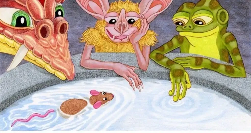 Pepe 青蛙的创作者 Matt Furie,在 1999 年出版了他的第一本书《The Night Riders》。这是一本无字绘本,主角是四个动物角色:青蛙、老鼠、龙和蝙蝠。多年来没有人知道那只青蛙叫什么名字,直到有人翻出书末的注记,发现它叫 Mystery。