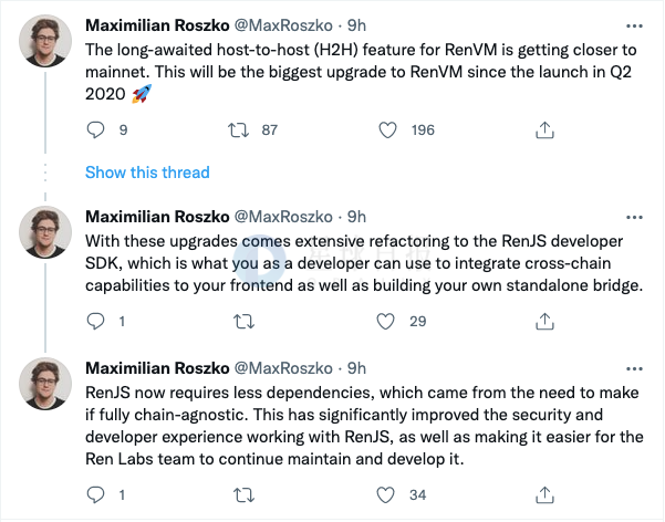 跨链协议Ren的生态建设者Maximilian Roszko发推表示,RenVM主网即将上线Host-to-Host(H2H)功能,这将是自2020年第二季度协议推出以来对RenVM的最大升级。H2H意味着RenVM将能够在它支持的链之间桥接原生代币,将支持7种资产,包括BTC、DOGE等,未来将包括数千种代币。