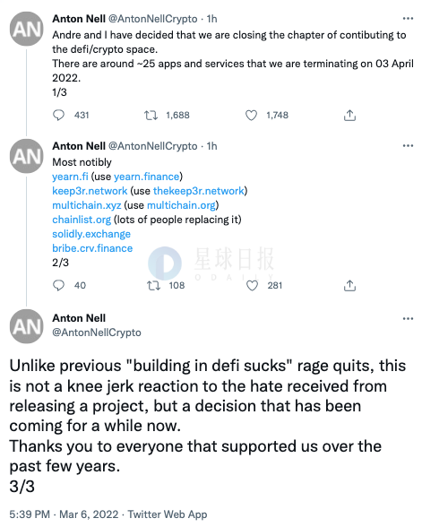 Fantom高级解决方案架构师Anton Nell发推称,Andre Cronje与自己两人决定不再继续为DeFi和加密货币领域做出贡献。两人参与开发的25个相关应用程序和服务将于4月3日停止运营,其中值得关注的项目包括Yearn Finance、Keep3r Network、Multichain.xyz、Chainlist、Solidly和Bribe.crv.finance。