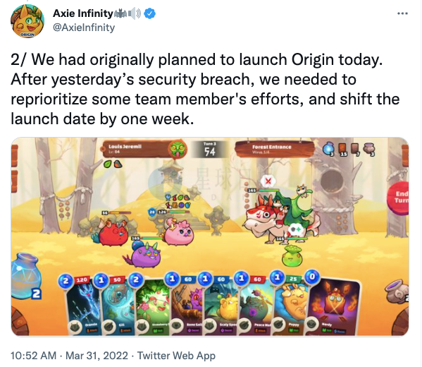 P2E游戏Axie Infinity发推表示:“我们原计划今天推出Origin。在经历了最近的安全事件之后,我们需要重新调整一些团队成员的工作优先级,并将发布日期推迟一周。我们将于4月7日上线Origin alpha版本。”