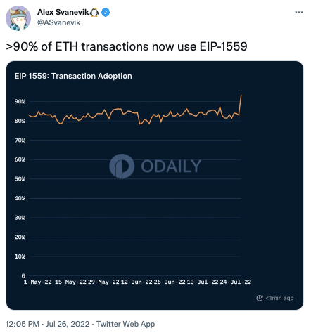 Nansen首席执行官Alex Svanevik发推称,目前超过90%的ETH交易使用EIP-1559。