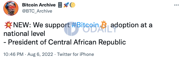 星球日报讯 据比特币分析师Bitcoin Archive发布的推文,中非共和国总统表示,支持比特币在全国范围内使用。