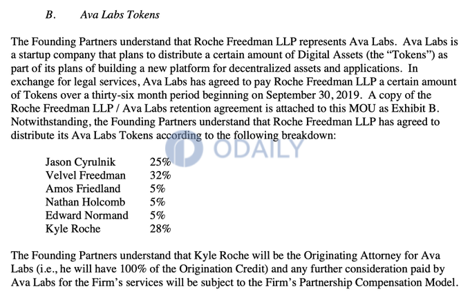 Odaily星球日报讯 爆料Ava Labs恶意竞争的媒体Crypto Leaks针对Ava Labs的创始人Emin Gün Sirer发表的关于“怎么会有人相信像Cryptoleaks上的阴谋论胡说八道这样荒谬的事情”的指责,公开一张美国律师事务所Roche Freedman内部AVAX代币分配的条款,其中爆料人Kyle Roche分配占比28%,创始合伙人Jason Cyrulnik分配占比25%。