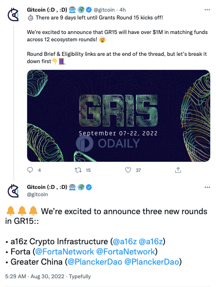 据此前报道,Gitcoin将于9月7日至22日进行第15轮捐赠活动。