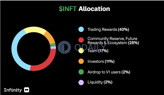 Odaily星球日报讯 NFT市场Infinity宣布发布公开版本,并公布代币INFT细节和上线交易挖矿激励,将向V1用户空投代币总量的2%。INFT代币总量20亿枚,其中,40%用于交易奖励,28%用于社区储备、未来奖励和生态,17%分配给团队,11%分配给投资者,2%用于流动性。在代币发布时,有2亿枚代币流通。