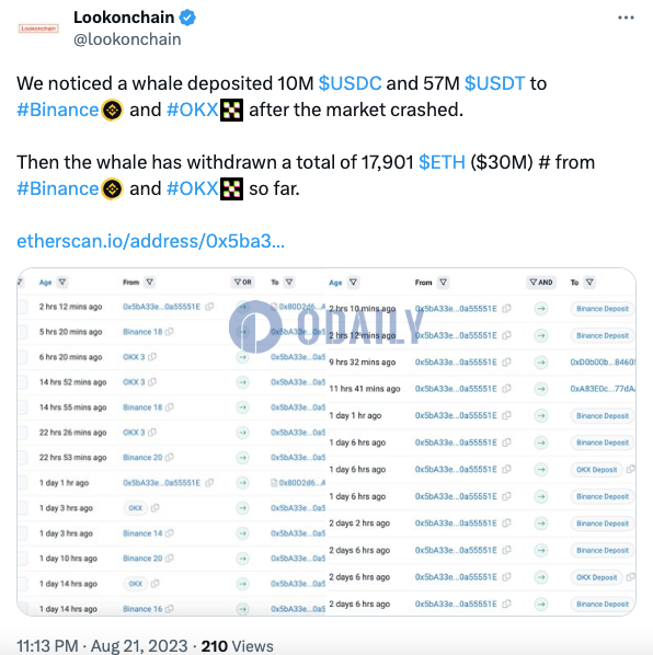 某鲸鱼在市场暴跌后共从币安和OKX抄底买入17901枚ETH