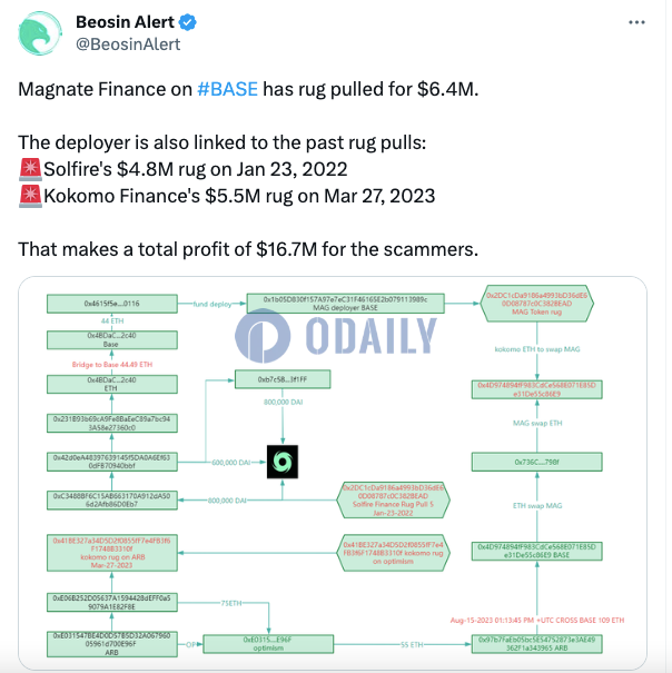 Odaily星球日报讯 据Beosin Alert监测,Magnate Finance部署者地址与此前发生Rug Pull的Solfire、 Kokomo Finance有关。