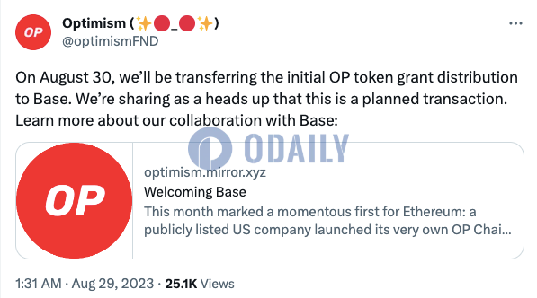 Odaily News ตามข่าวอย่างเป็นทางการ Optimism ประกาศว่าจะมีการแจกจ่ายโทเค็น OP เริ่มต้นให้กับ Base ในวันที่ 30 สิงหาคม และได้แจ้งล่วงหน้าว่านี่คือธุรกรรมที่วางแผนไว้ ข่าวก่อนหน้านี้ นักพัฒนา Base และ Optimism ร่วมกันประกาศข้อตกลงการแบ่งรายได้และการแบ่งปันการกำกับดูแล โดยสัญญาอัจฉริยะของ Base สามารถอัปเกรดได้ผ่านบัญชีกระเป๋าเงินหลายลายเซ็น 2/2 เท่านั้น ลายเซ็นหนึ่งถูกควบคุมโดย Base และอีกลายเซ็นหนึ่งโดย Optimism Foundation Base จะจ่าย Optimism Collective 2.5% ของรายได้หรือ 15% ของกำไร แล้วแต่จำนวนใดจะมากกว่า ในทางกลับกัน Base สามารถรับ “โทเค็น OP สูงถึง 118 ล้าน” ในอีกหกปีข้างหน้า ซึ่งถือเป็นการกล่าวในการกำกับดูแลโปรโตคอลของ Optimism