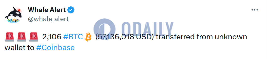 Odaily星球日报讯 据Whale Alert监测,2106枚BTC转入Coinbase,价值5713万美元。
