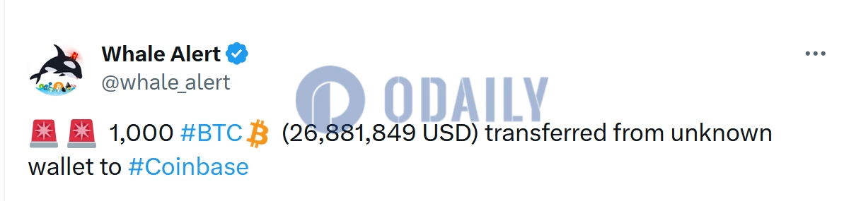 Odaily星球日报讯 据Whale Alert监测,1000枚BTC从未知钱包转入Coinbase,价值2688万美元。