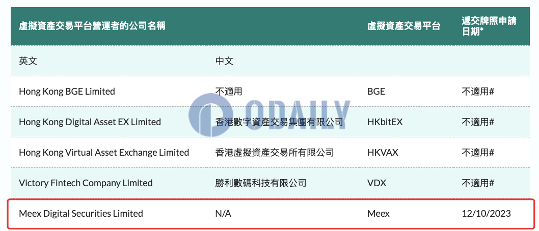 Odaily星球日报讯 香港证监会更新虚拟资产交易平台申请者名单,新增“Meex Digital Securities Limited”,目前该公司暂无中文名称,虚拟资产交易平台名称为“Meex”,其牌照申请递交日期为10月12日。