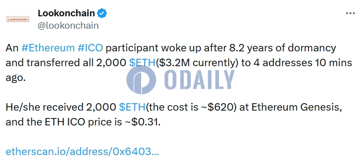 Odaily星球日报讯 据Lookonchain监测,某参与ETH ICO地址将其全部2000枚ETH分发至4个地址,价值320万美元,其ICO成本约620美元。
