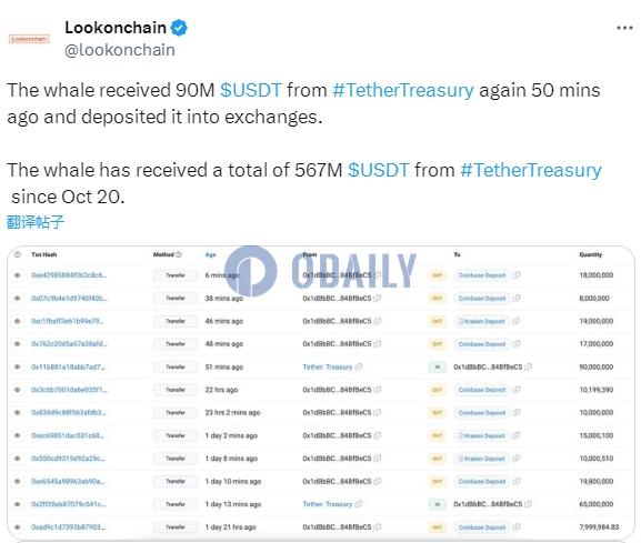 Odaily星球日报讯 据Lookonchain监测,某巨鲸从Tether收到9000万枚USDT并转入交易所,自10月20日以来,该巨鲸已累计收到5.67亿枚USDT。