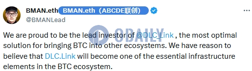 Odaily星球日报讯 ABCDE Labs联创BMAN.eth于X平台发文表示,ABCDE成为DLC.Link的主要投资者,旨在将BTC引入其他生态系统。