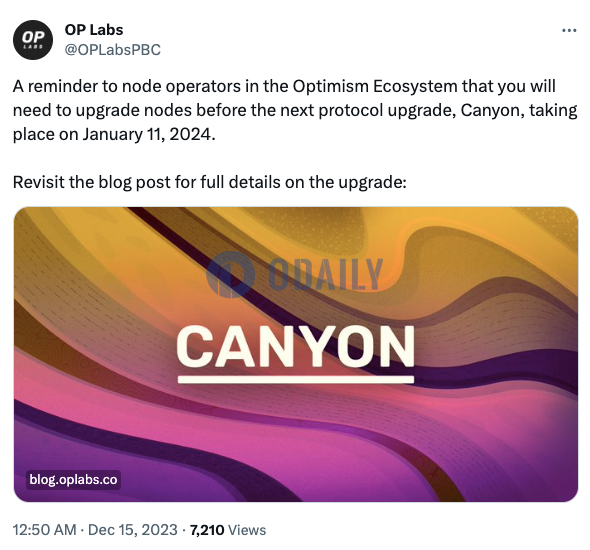 Odaily News OP Labs issued a reminder on the X platform that Optimism ecological node operators need to upgrade their nodes before the protocol upgrade (Canyon) on January 11, 2024.