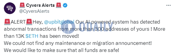 Odaily星球日报讯 Cyvers Alerts于X平台发文表示,发现Upbit 300多个地址的异常交易,超1.3万枚ETH被转移,但未发现任何维护或迁移公告,可能存在异常。