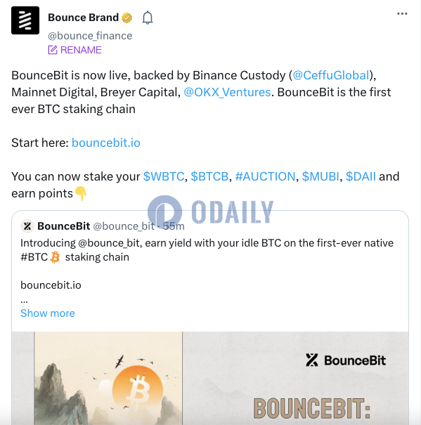 Odaily星球日报讯 Bounce Brand 在X平台宣布旗下比特币质押链 BounceBit 已上线,由 Binance Custody、Mainnet Digital、Breyer Capital、OKX Ventures 提供支持。用户现可质押 WBTC、BTCB、AUCTION、MUBI 和 DAII 以赚取积分。