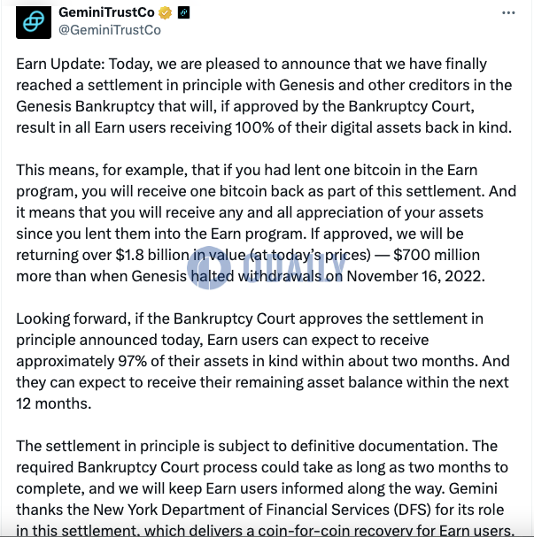 Gemini Trust:若获法院批准,Gemini Earn用户将获得100%实物数字资产返还