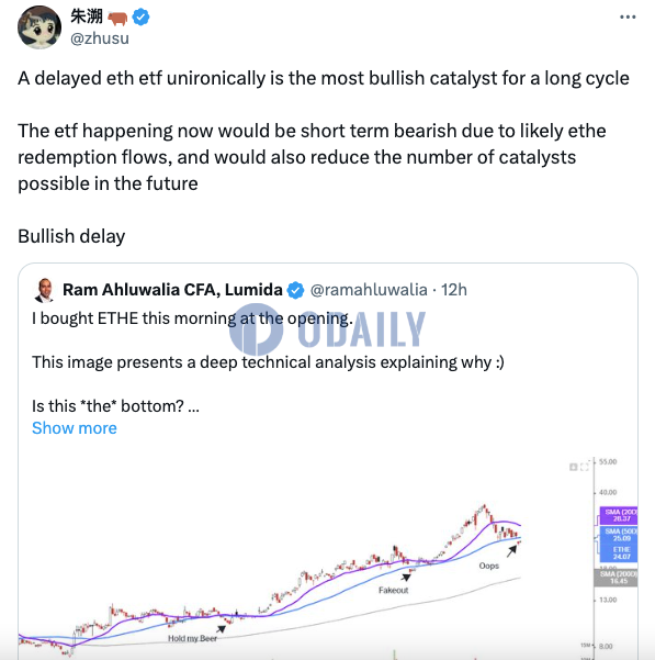 Odaily星球日报讯 Su Zhu 在 X 平台发文表示,长期来看,延迟批复以太坊 ETF 是一项最看涨的催化剂,因为现货以太坊 ETF 一旦被批准上市,可能导致出现 ETH 赎回流,或许会像现在 ETF 市场中所表现的那样短期走低,同时也会减少未来可能的“催化剂”数量。