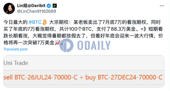 Deribit上BTC大宗期权卖出7月底7万美元看涨期权,并买入年底7万美元看涨期权