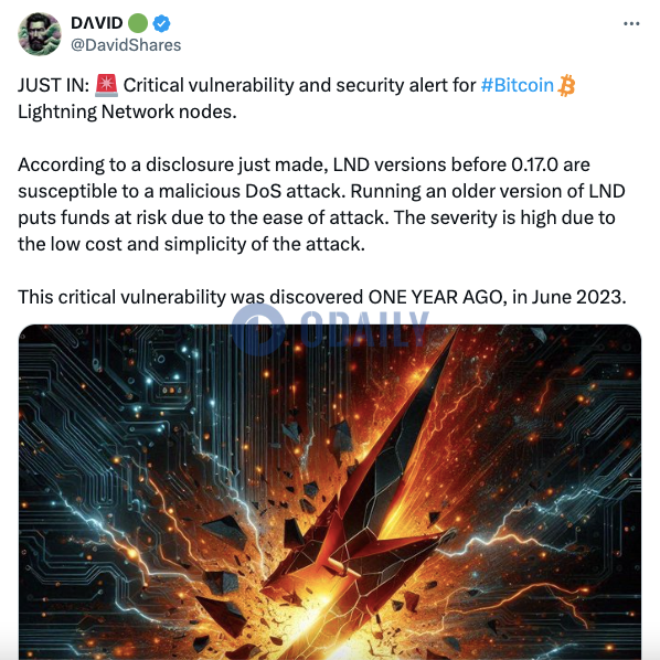 根据 X 平台用户@DavidShares 分享的信息,0.17.0 之前的 LND 版本容易受到恶意 DoS 攻击。运行旧版本的 LND 会使资金面临风险,因为容易发生攻击。由于攻击成本低且操作简单,此漏洞严重性很高。该漏洞是在一年前,即 2023 年 6 月发现的。