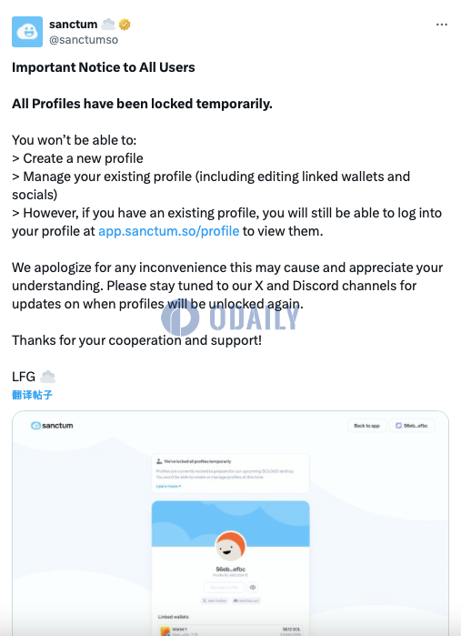 Odaily星球日报讯 Sanctum 在 X 平台发布重要通知,称所有用户的个人 Profile 目前已被暂时锁定。用户目前将无法创建新个人 Profile;管理现有个人 Profile(包括编辑关联的钱包和社交资料);但已有个人 Profile 仍可以登录 https://app.sanctum.so/profile 查看。个人 Profile 功能何时解锁将于后续在 X 平台和 Discord 频道另行通知。