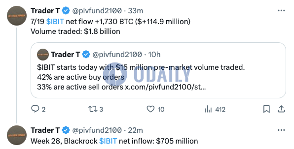 Odaily星球日报讯 据 Trader T 监测,昨日贝莱德 IBIT 净流入 1,730 枚 BTC,交易量达 18 亿美元;在上市以来的第 28 周,IBIT 累计净流入 7.05 亿美元。