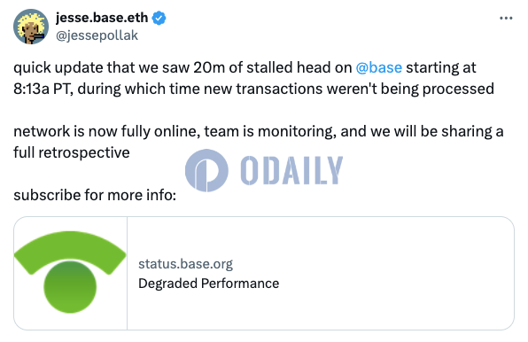 Base协议负责人:Base网络恢复全面运行,团队正在监控
