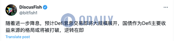 Odaily星球日报讯 神鱼(@bitfish1)于 X 发文表示:“随着进一步降息,预计 DeFi 套息交易即将大规模展开,国债作为 DeFi 主要收益来源的格局或将被打破,逆转在即。”