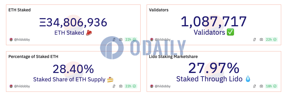 以太坊信标链质押总量超3480万枚ETH,质押率达28.4%