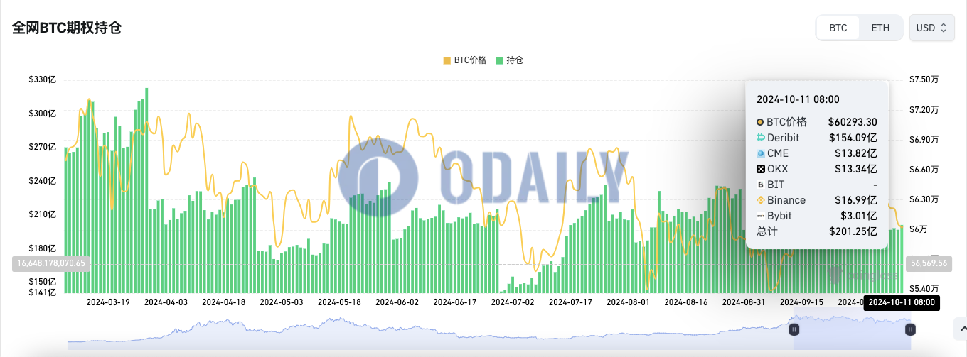 全网BTC期权未平仓头寸超200亿美元,ETH期权未平仓头寸近52亿美元