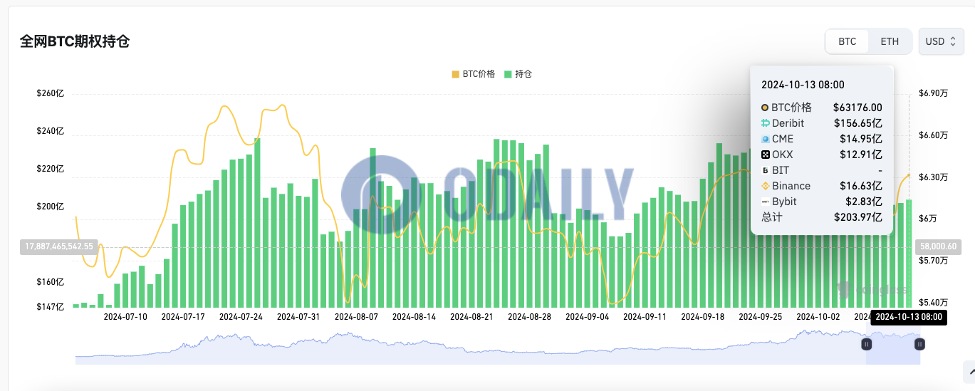 全网BTC期权未平仓头寸为203.97亿美元,ETH期权未平仓头寸为48.08亿美元