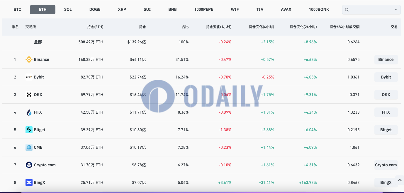 其中币安 ETH 合约未平仓头寸为 160.38 万枚 ETH(约合 44.11 亿美元),排名第一,24H 涨幅为 6.63%。