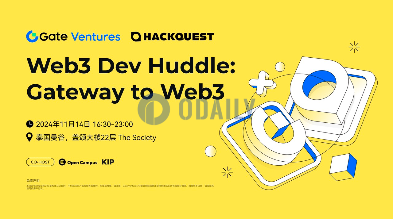 Odaily星球日报讯 据官方消息,Gate Ventures 将于 2024 年 11 月 14 日在曼谷与 HackQuest 联合举办 Web3 Dev Huddle 边会,一项专为开发者社区打造的互动活动。本次活动将汇聚业内重磅嘉宾,带来涵盖区块链生态系统、Web3 与 AI 融合的前沿发展等内容分享,为开发者呈现投资者视角下的独到见解。