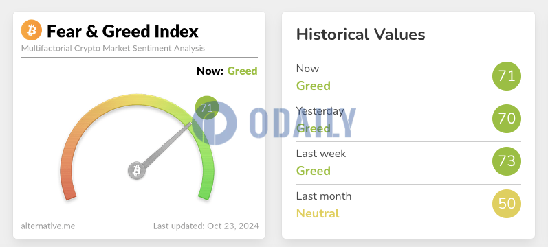 今日恐慌与贪婪指数升至71,等级仍为贪婪