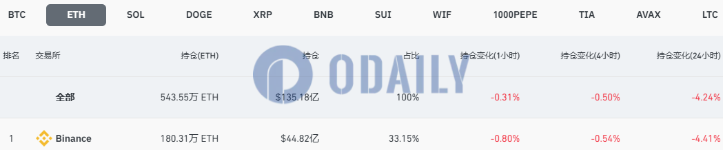 Odaily星球日报讯 Coinglass 数据显示,全网 ETH 期货合约未平仓头寸为 543.55 万枚 ETH,约合 135.18 亿美元,24H 跌幅 4.24%。