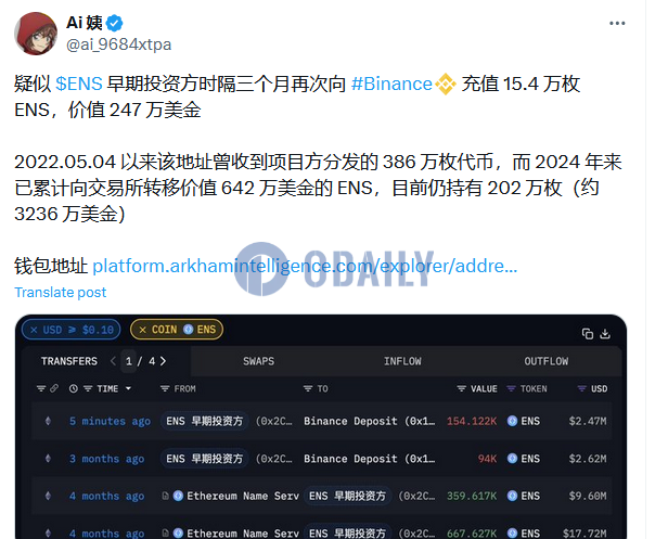 Odaily星球日报讯 据@ai_9684xtpa 监测,疑似 ENS 早期投资方时隔三个月再次向币安充值 15.4 万枚 ENS,价值 247 万美元。2022 年 5 月 4 日以来该地址曾收到项目方分发的 386 万枚代币,而 2024 年来已累计向交易所转移价值 642 万美元的 ENS,目前仍持有 202 万枚(约 3236 万美元)。