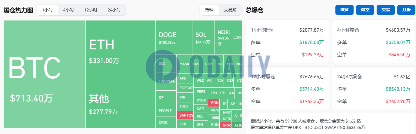 Odaily星球日报讯 Coinglass 数据显示,过去 1 小时全网爆仓 2077.87 万美元,其中多单爆仓 1878.08 万美元,空单爆仓 199.79 万美元。