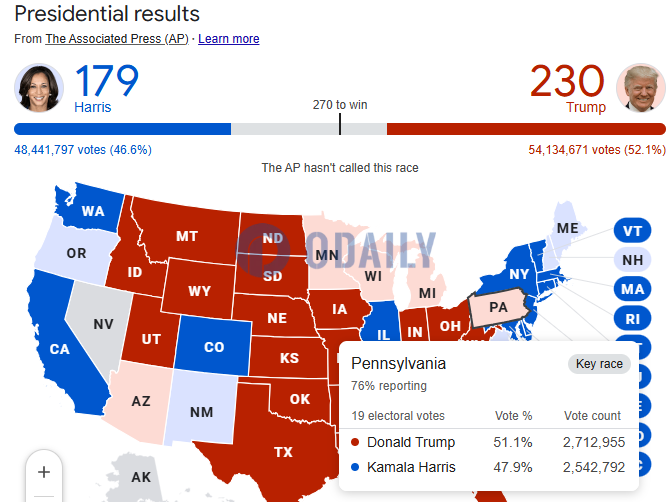 Odaily星球日报讯 据 Google 实时数据显示,选举人票最多的关键“摇摆州”宾夕法尼亚州(19 票)开票进度已达 76%,目前特朗普以 51.1%的得票率领先哈里斯(47.9%)。