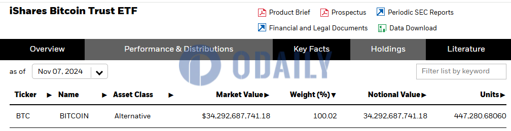 Odaily星球日报讯 贝莱德官方更新数据显示,截至 11 月 7 日,贝莱德比特币 ETF 持仓达到 447,280.6806 枚 BTC,市值突破 340 亿美元,触及 34,292,687,741.18 美元。