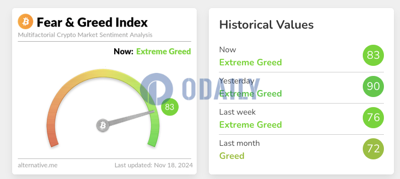 今日恐慌与贪婪指数降至83,等级仍为极度贪婪