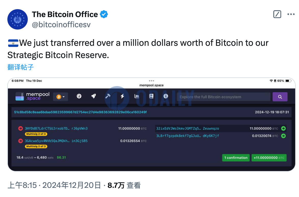Odaily星球日报讯 萨尔瓦多比特币办公室在 X 平台发文宣布,已将价值 100 万美元的 BTC 转入萨尔瓦多的战略比特币储备。