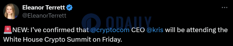 Odaily星球日报讯 据记者 Eleanor Terrett 报道,Crypto.com 首席执行官 Kris Marszalek 将于本周五参加白宫举办的加密货币峰会。