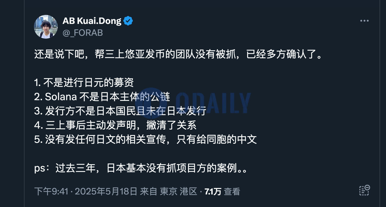 Odaily星球日报讯 据社区消息,关于三上悠亚代币发行团队是否在日本被捕存在争议。KOL @cryptobraveHQ 称该团队因未备案募资在日被捕,目前三上代币团队募资地址仍持有约 160 万美元的 Sol;另一 KOL @_FORAB 则表示已多方确认团队未被捕,称发行方非日本主体,未在日本发行,且主动声明与三上悠亚无关。目前该事件并未得到官方媒体证实,真相尚待进一步核实确认。