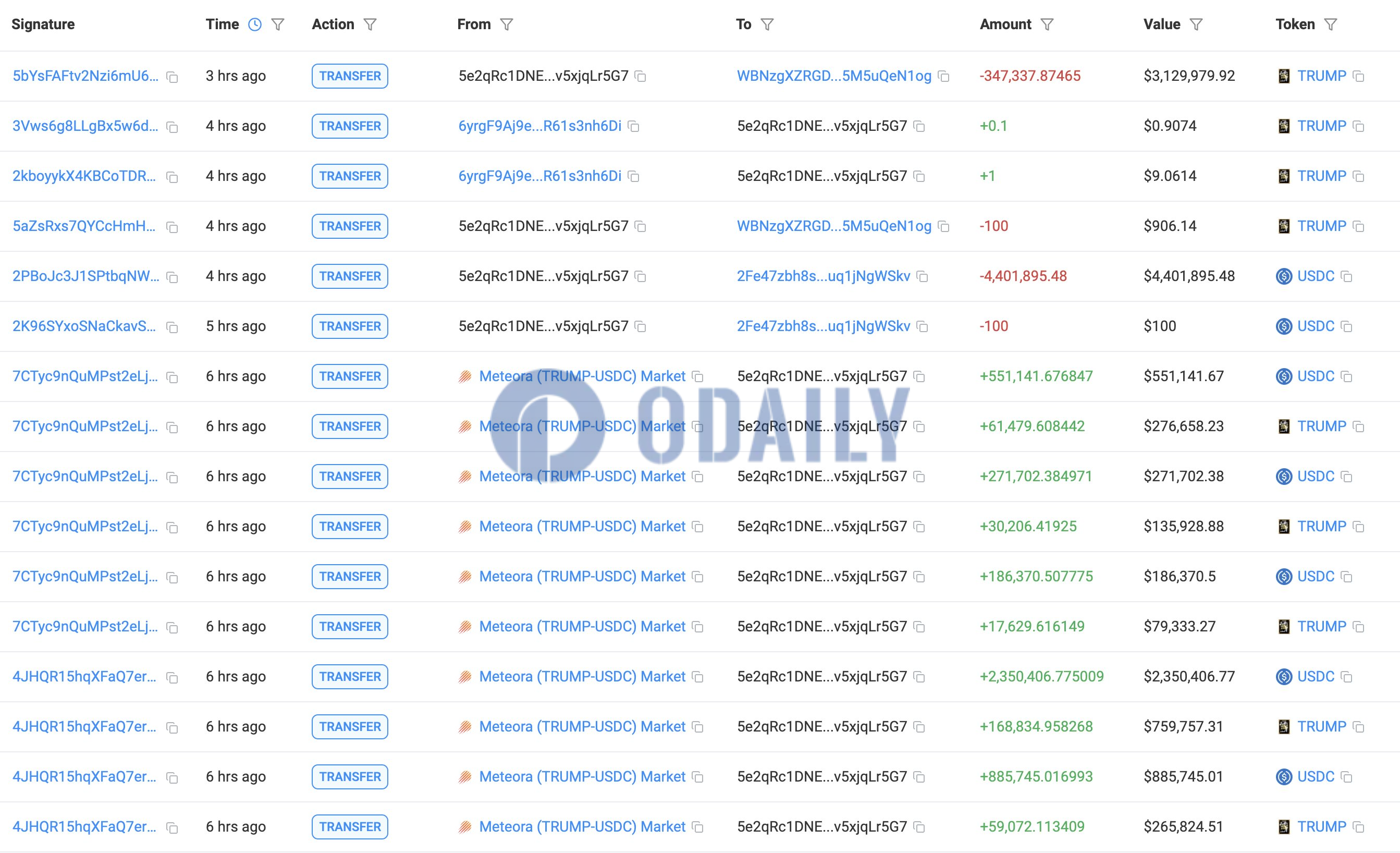 Odaily星球日报讯 据@lookonchain 监测,约 6 小时前,TRUMP 团队移除了由 440 万枚 USDC 与 347,438 枚 TRUMP(约合 312 万美元)组成的流动性资金。