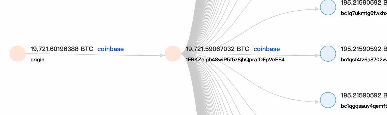 北京链安Chainsmap监测系统发现,北京时间8月18日凌晨2点16分发生的业界热议的19721.59 BTC(价值超过2.43亿美元)的转账,实际上是coinbase的内部操作,在此操作中,这笔巨额比特币从12BZD75sb开头地址转入1FRKZeipb开头地址,并在此后将其中大部分拆分成100份等额的UTXO,这也是coinbase常见的运营操作,无需过度解读。