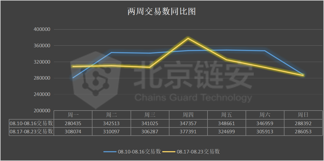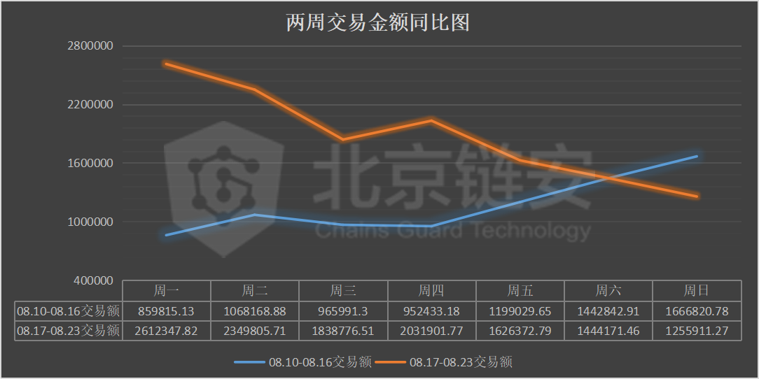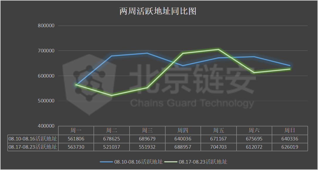 从过去一周(08.17-08.23)数据来看,由于个别机构的链上运营策略,使得链上交易额大幅上涨,但是实际交易额下降。其它链上数据整体未体现出太大变化,大都呈现个位数的百分比浮动。